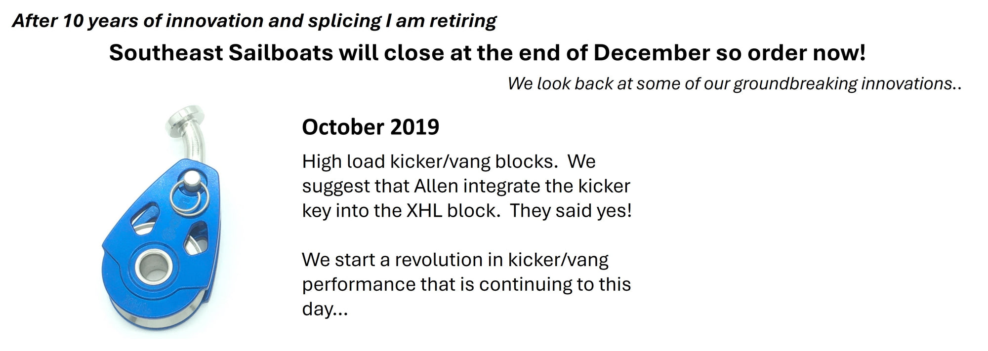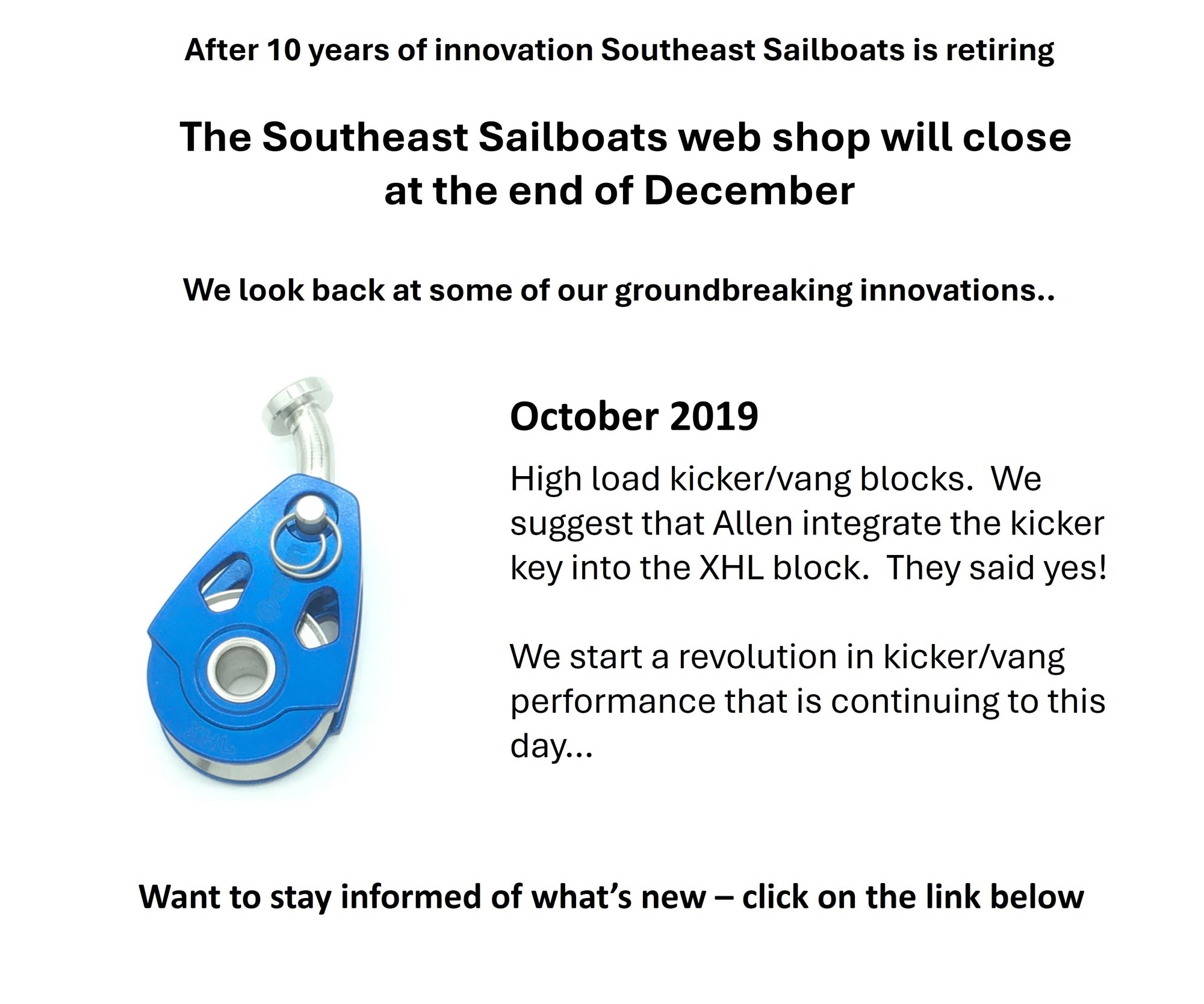 In stock at Southeast Sailboats! Southeast Sailboats has been working closely on this great block with Harken and testing it for the last 18 months. One of the prototypes was used as part of Southeast Sailboats rigging at the Paris Olympics! Available as the block by itself or as part of a complete kicker/vang system,