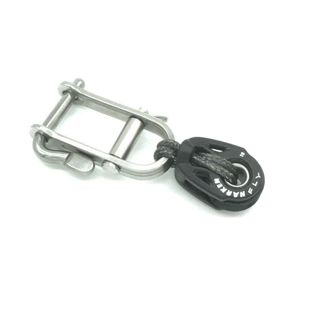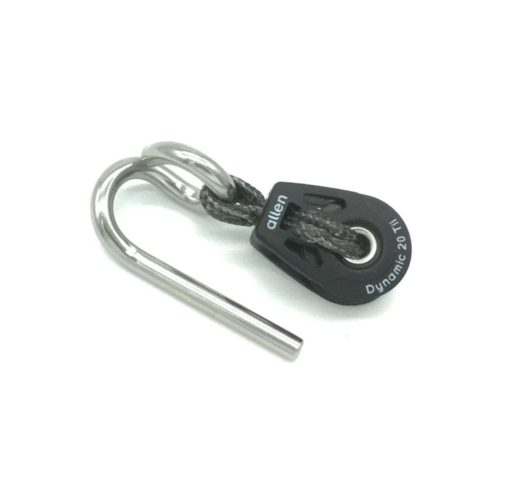 Clew blocks with an easy release mechanism - hook or shackle. The use of a hook or shackle is mainly down to personal preference, but we feel that the shackles are more secure. Both the Allen and Ronstan shackles have a 'click' secure lock so that you know by feel when they are properly locked. The Ronstan shackle has a large lever that makes it easier to use, particularly with cold fingers or gloves.